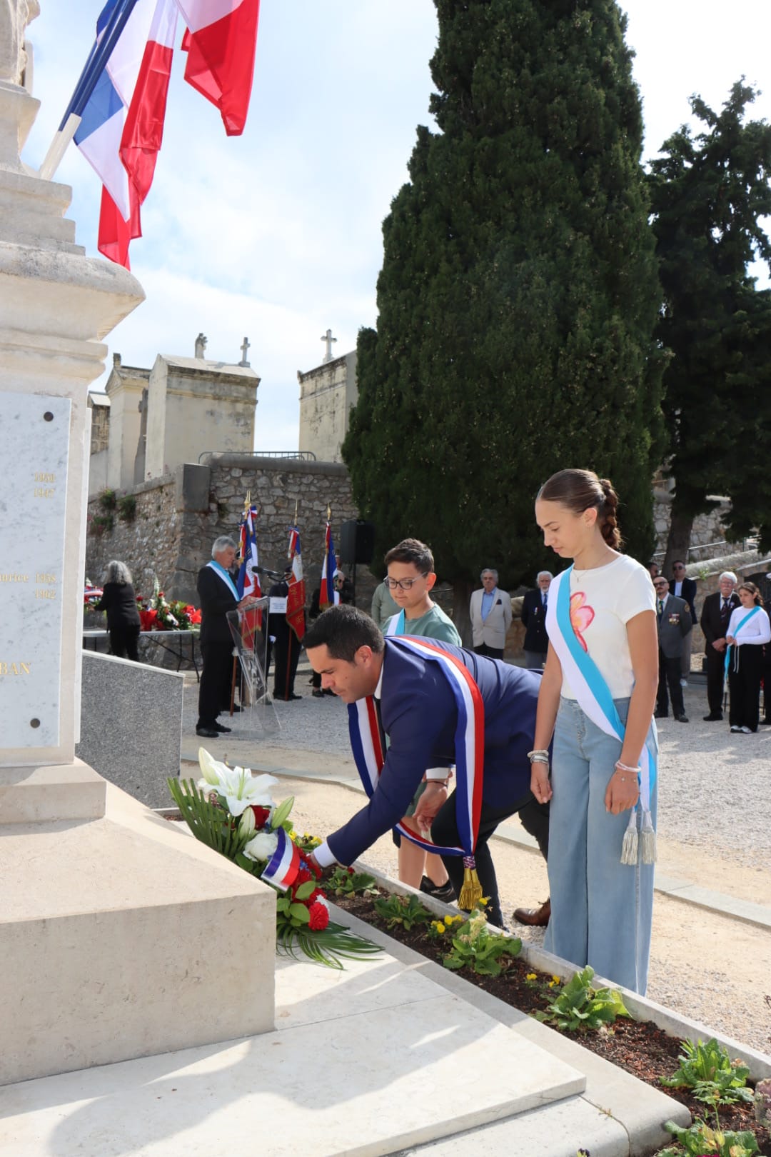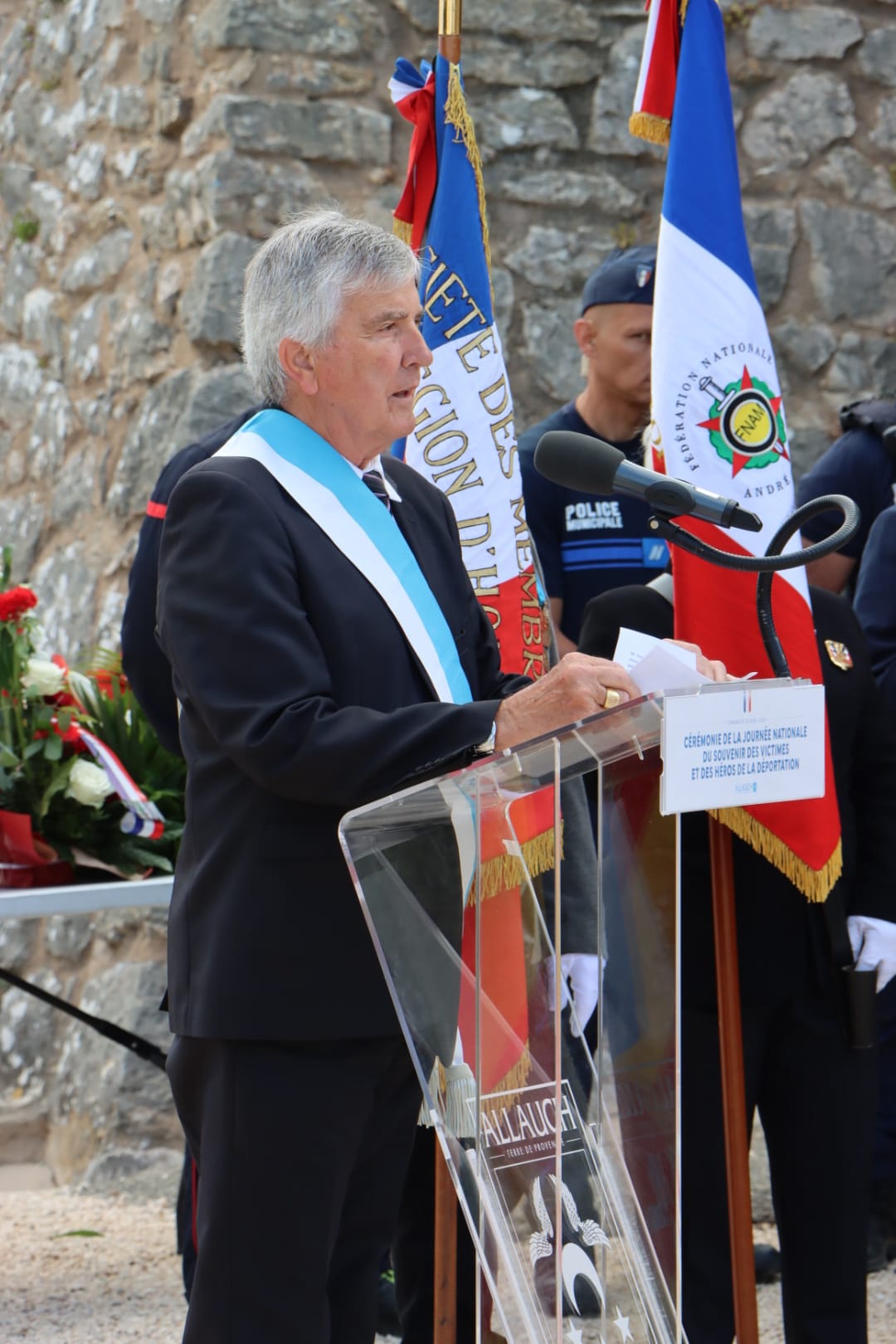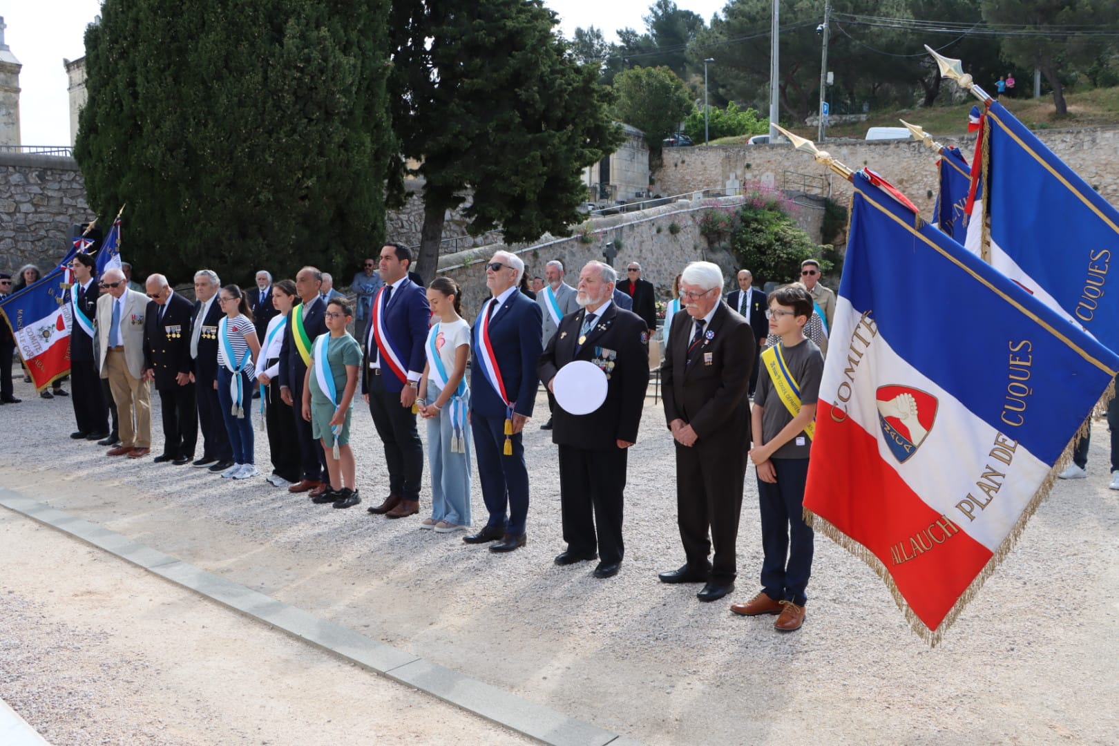 En présence notamment de Monsieur le Maire Lionel de Cala, d’Henri Carvin (conseiller municipal délégué au Monde Combattant), de Robert Giraud (conseiller municipal délégué aux anciens combattants représentant Laurent Simon, maire de Plan-de-Cuques) du député José Gonzalez, des présidents d’associations d’Anciens Combattants, des Porte-Drapeaux d’Allauch, des membres du Conseil Municipal des Jeunes, du Conseil Départemental Jeunes et du Parlement Régional Jeunes.