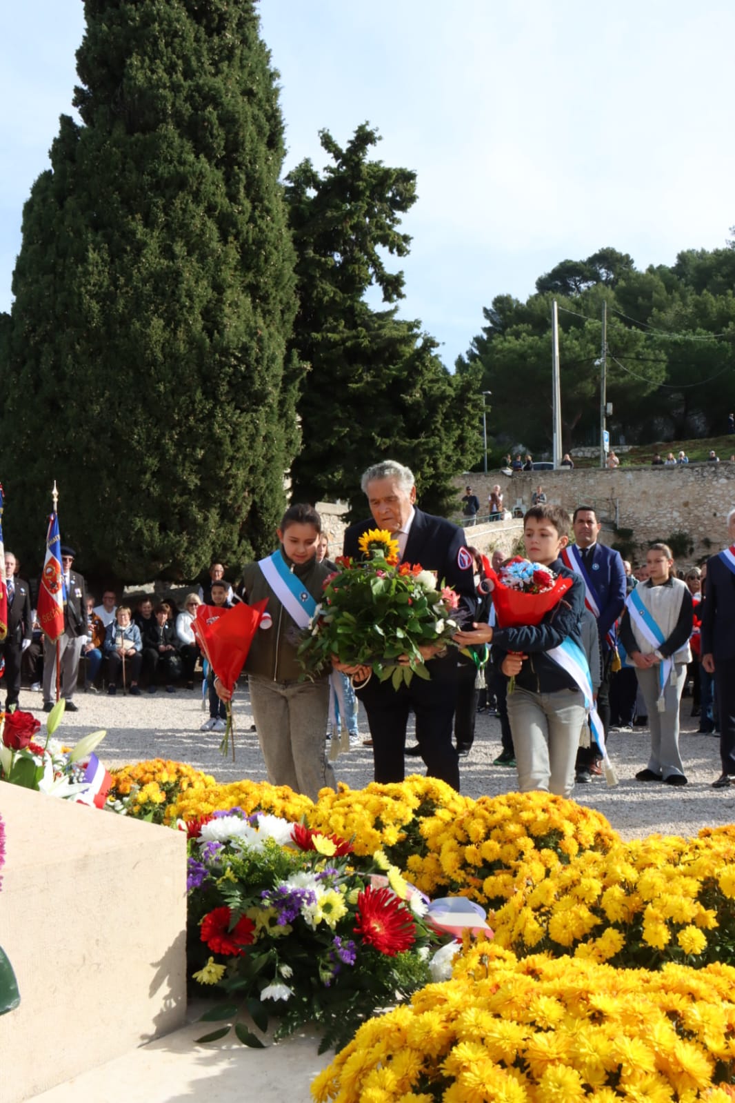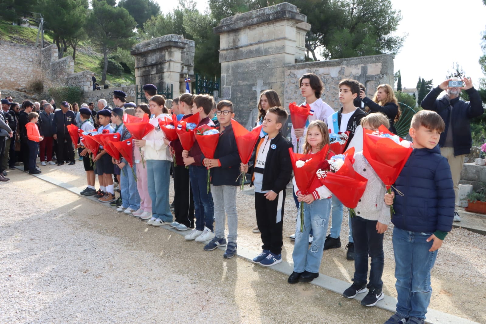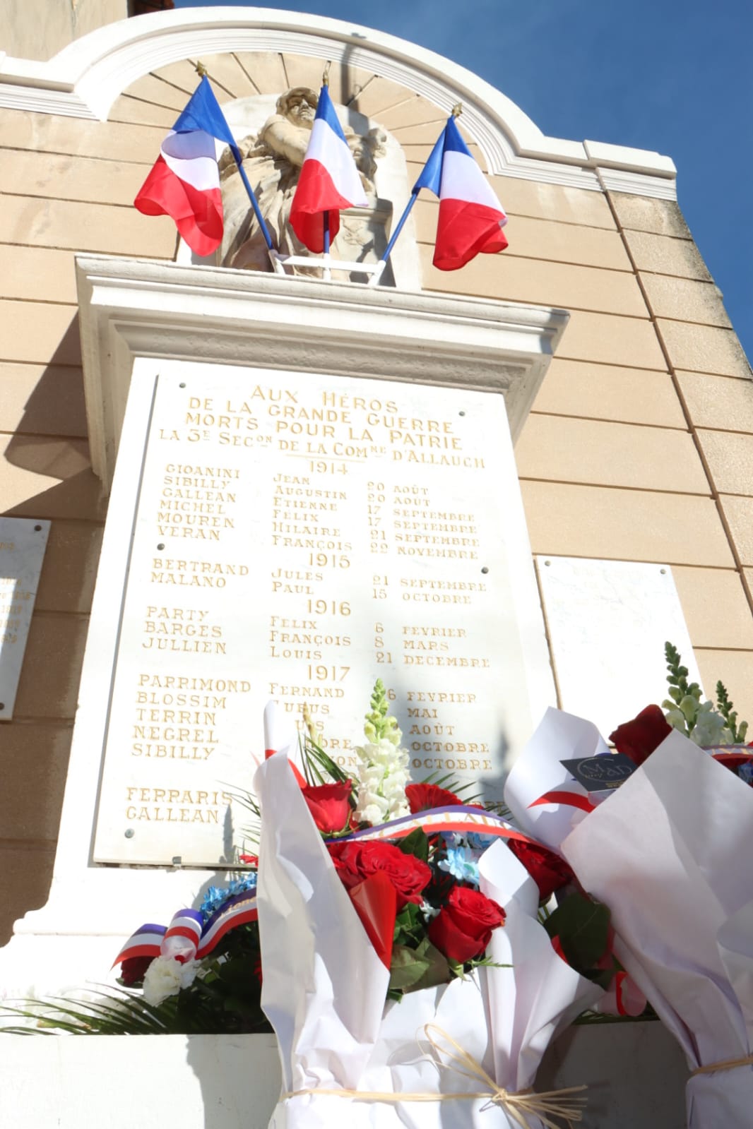 Après des dépôts de gerbes aux Monuments aux Morts de la Bourdonnière et de la Pounche, le cortège des associations d’anciens combattants (UNC, FNACA… ainsi que Le Souvenir Français), du Conseil Municipal Jeunes, des élèves de CM1 et CM2 de la commune, d’un représentant du Conseil Départemental des jeunes (CDJ 13), d’un Conseiller des Jeunes Métropolitains (CJM) et de membres du Parlement Régional de la Jeunesse s’est rendu au Monument aux Morts du cimetière d’Allauch-village. L’émotion était palpable au moment du dépôt de fleurs en hommage aux Morts pour la France, tombés durant la Première Guerre Mondiale.