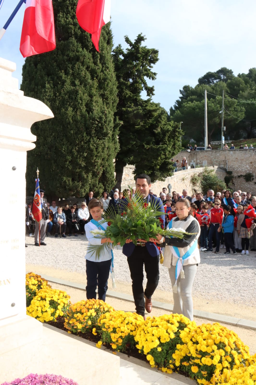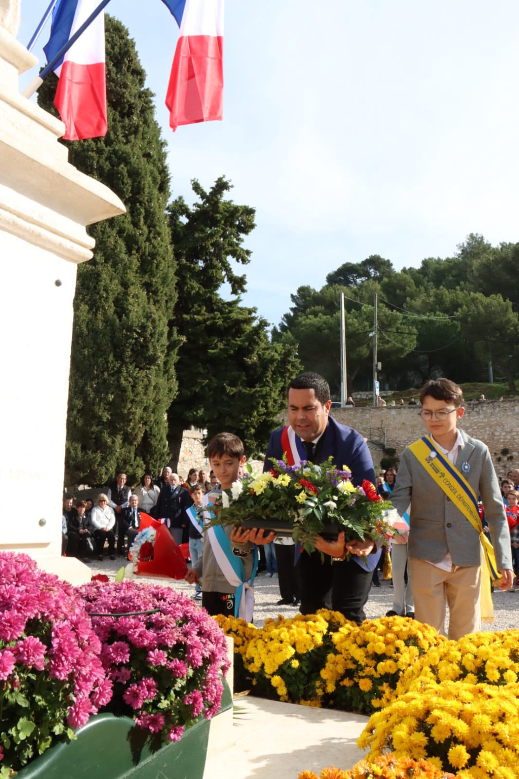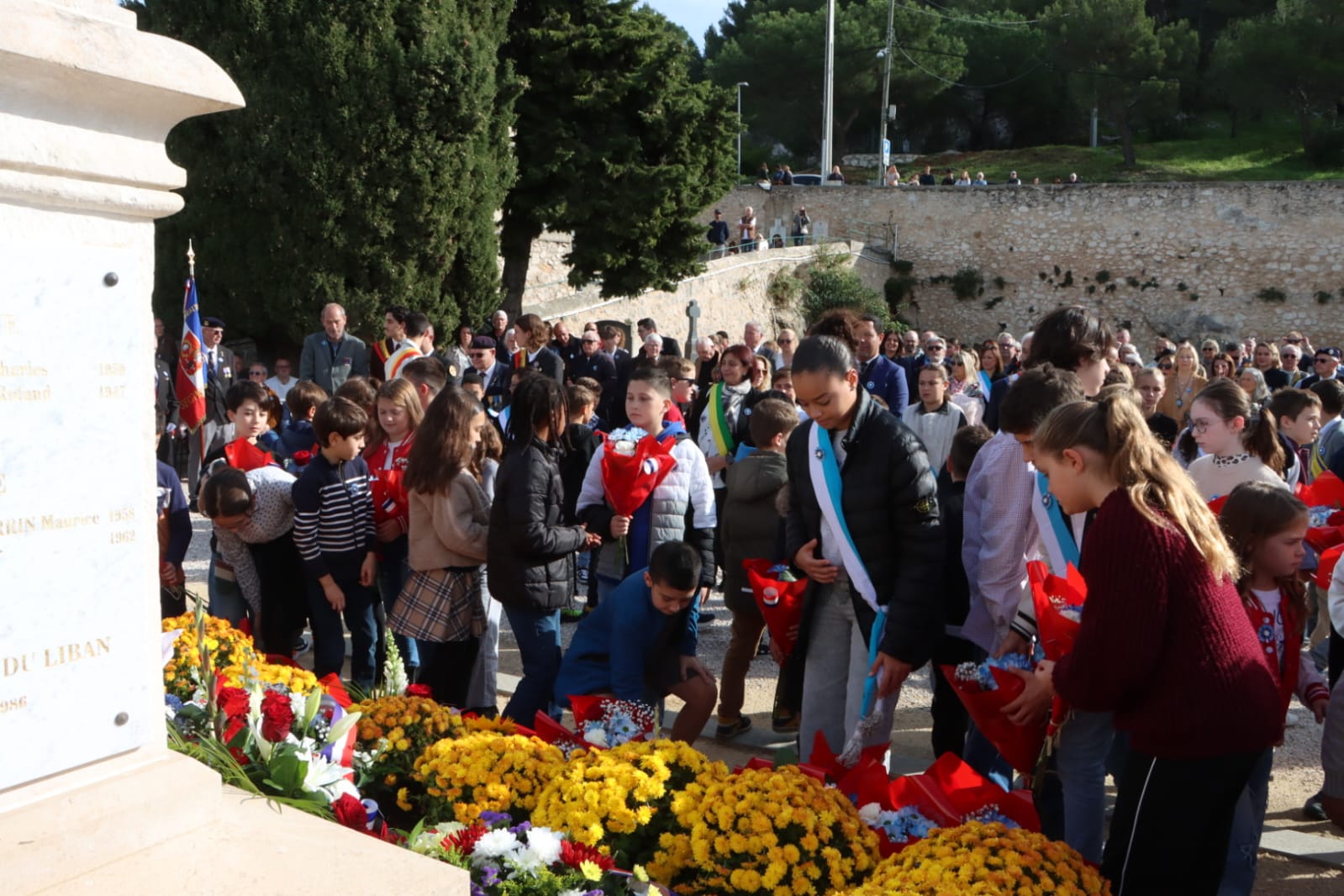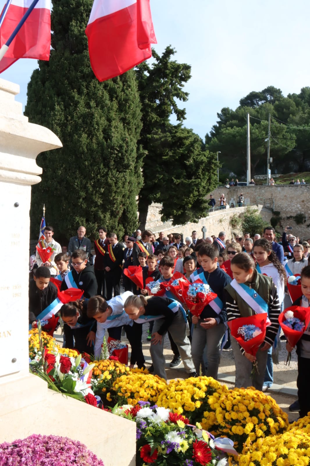 Après des dépôts de gerbes aux Monuments aux Morts de la Bourdonnière et de la Pounche, le cortège des associations d’anciens combattants (UNC, FNACA… ainsi que Le Souvenir Français), du Conseil Municipal Jeunes, des élèves de CM1 et CM2 de la commune, d’un représentant du Conseil Départemental des jeunes (CDJ 13), d’un Conseiller des Jeunes Métropolitains (CJM) et de membres du Parlement Régional de la Jeunesse s’est rendu au Monument aux Morts du cimetière d’Allauch-village. L’émotion était palpable au moment du dépôt de fleurs en hommage aux Morts pour la France, tombés durant la Première Guerre Mondiale.