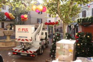 La place de l’Hôtel de ville devient l’espace de quelques jours un véritable village de fête : chalets en bois, forêt de sapins ainsi que de nombreux ornements rouge et or. Ces installations serviront de décor de « fiction », devant le célèbre Bar du Mistral, jusqu’au 30 septembre.