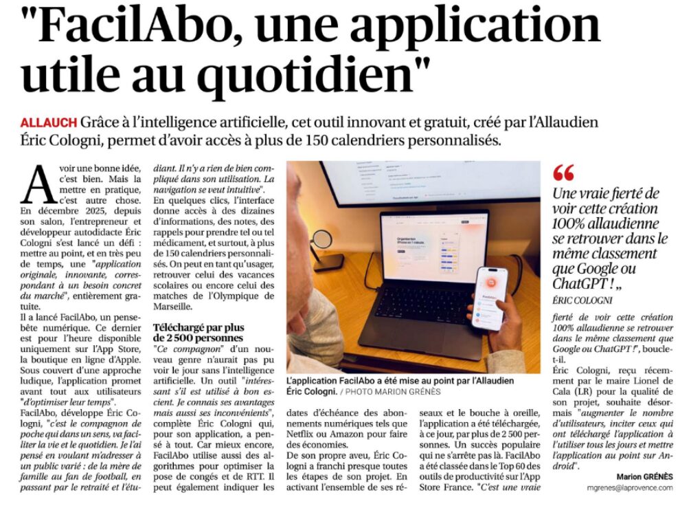 Depuis son domicile, il a codé cet outil qu’il a nommé « FacilAbo ». Objectif affiché : « récupérer du temps pour ce qui compte vraiment ». Grâce à son application, les utilisateurs peuvent ajouter automatiquement plus de 170 calendriers thématiques directement dans l’agenda de leur téléphone portable, en un seul clic. À ce titre, un calendrier spécifique répertoriant tous les évènements d’Allauch est d’ailleurs en préparation : de la Fête de la Saint-Clair jusqu’à la Descente des Bergers, les principales dates de l’année seront recensées !