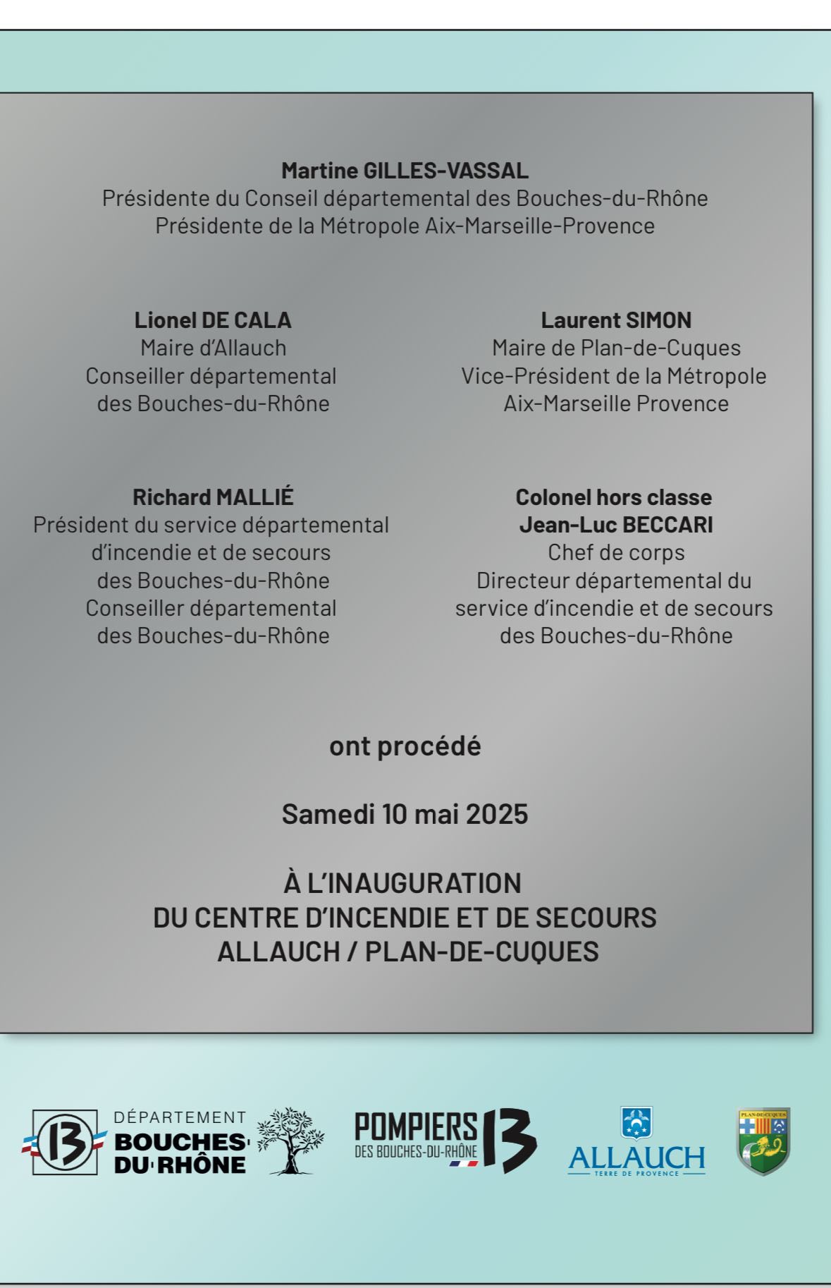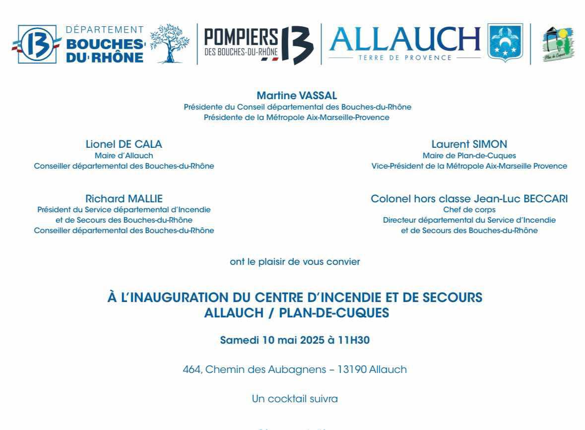 Le Maire d’Allauch, le Maire de Plan-de-Cuques, et Richard Mallié, Président du SDIS 13, ont officiellement inauguré la nouvelle caserne des sapeurs-pompiers d’Allauch et de Plan-de-Cuques, ce samedi 10 mai, à Allauch (chemin des Ateliers, dans le secteur des Aubagnens). Même si la Présidente du Département n’a pas pu être présente en raison des obsèques des anciens Maires du Rove (Georges Rosso) et de Gardanne (Roger Meï), Monsieur le Maire a tenu à souligner le niveau d’engagement du Département des Bouches-du-Rhône, qui a intégralement financé cette caserne à hauteur de 6,6M€.