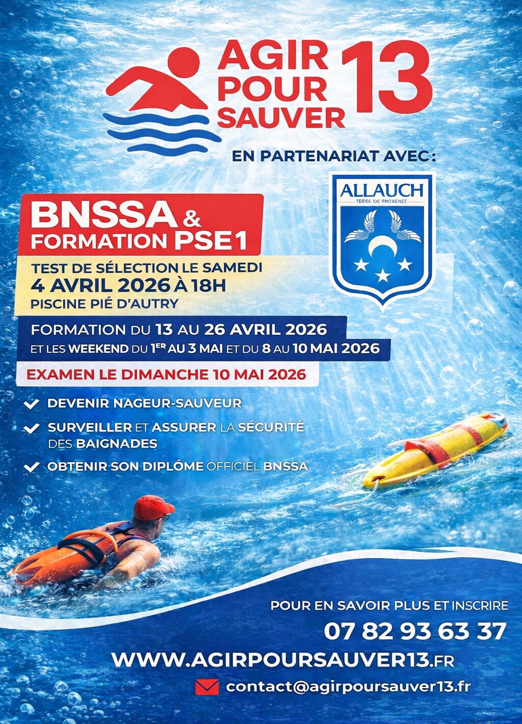 L’association « Agir pour Sauver 13 » organise, en partenariat avec la Ville d’Allauch, une session de formation au Brevet National de Sécurité et de Sauvetage aquatique (BNSSA) ainsi qu’une session de certification Premier Secours en équipe niveau 1 (PSE1), du 13 au 26 avril 2026, du 1er au 3 mai et du 8 au 10 mai à la piscine municipale d’Allauch avec un examen final le dimanche 10 mai 2026.