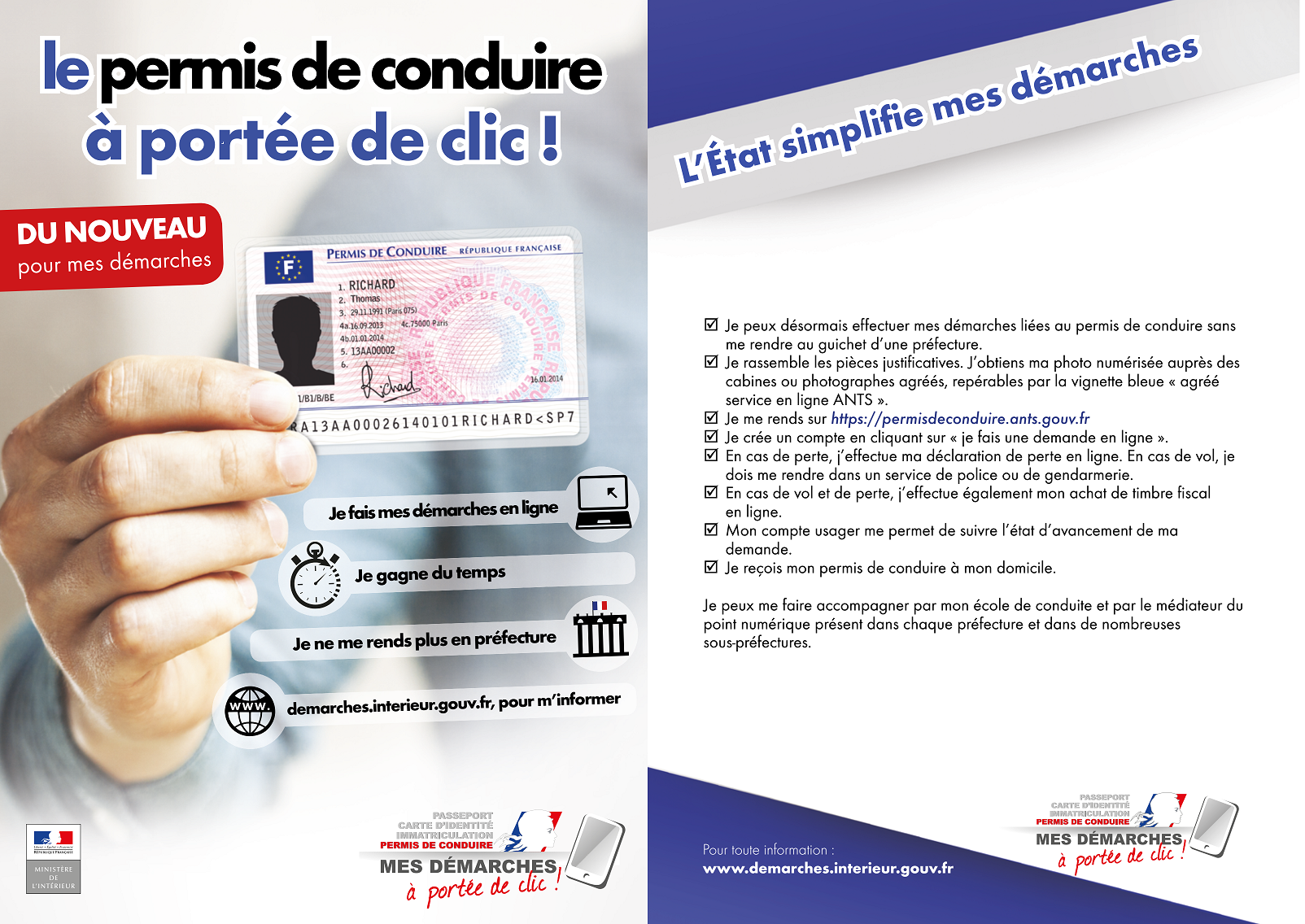 - de votre demande de permis de conduire sécurisé, toutes les démarches sont désormais disponibles en ligne sur le site https://permisdeconduire.ants.gouv.fr