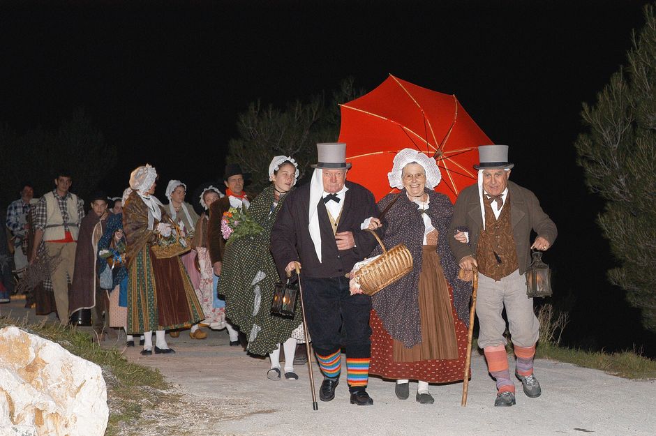 Au son des fifres et des tambourins, c’est une véritable crèche vivante qui anime la colline de Notre-Dame du Château. Commence alors une superbe procession, qui se dirige vers l’Église Saint-Sébastien, où sera célébrée la messe de minuit. Cette célébration s’achève par les offrandes déposées aux pieds de l’ « Enfant Roi ».